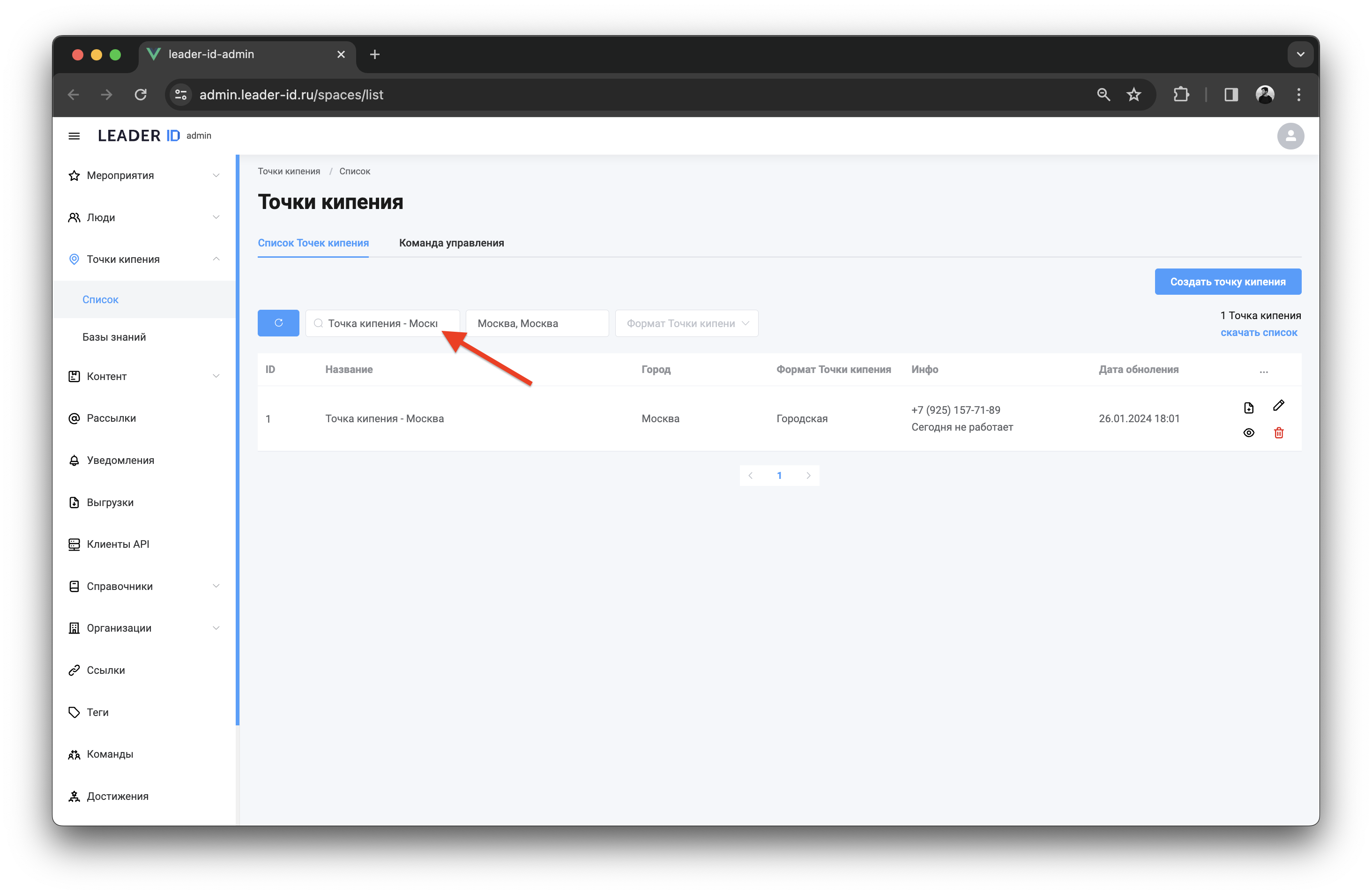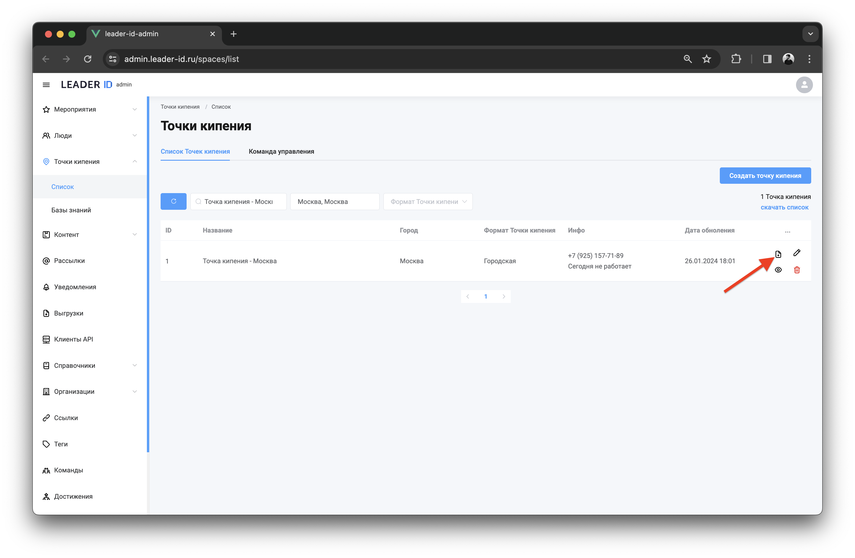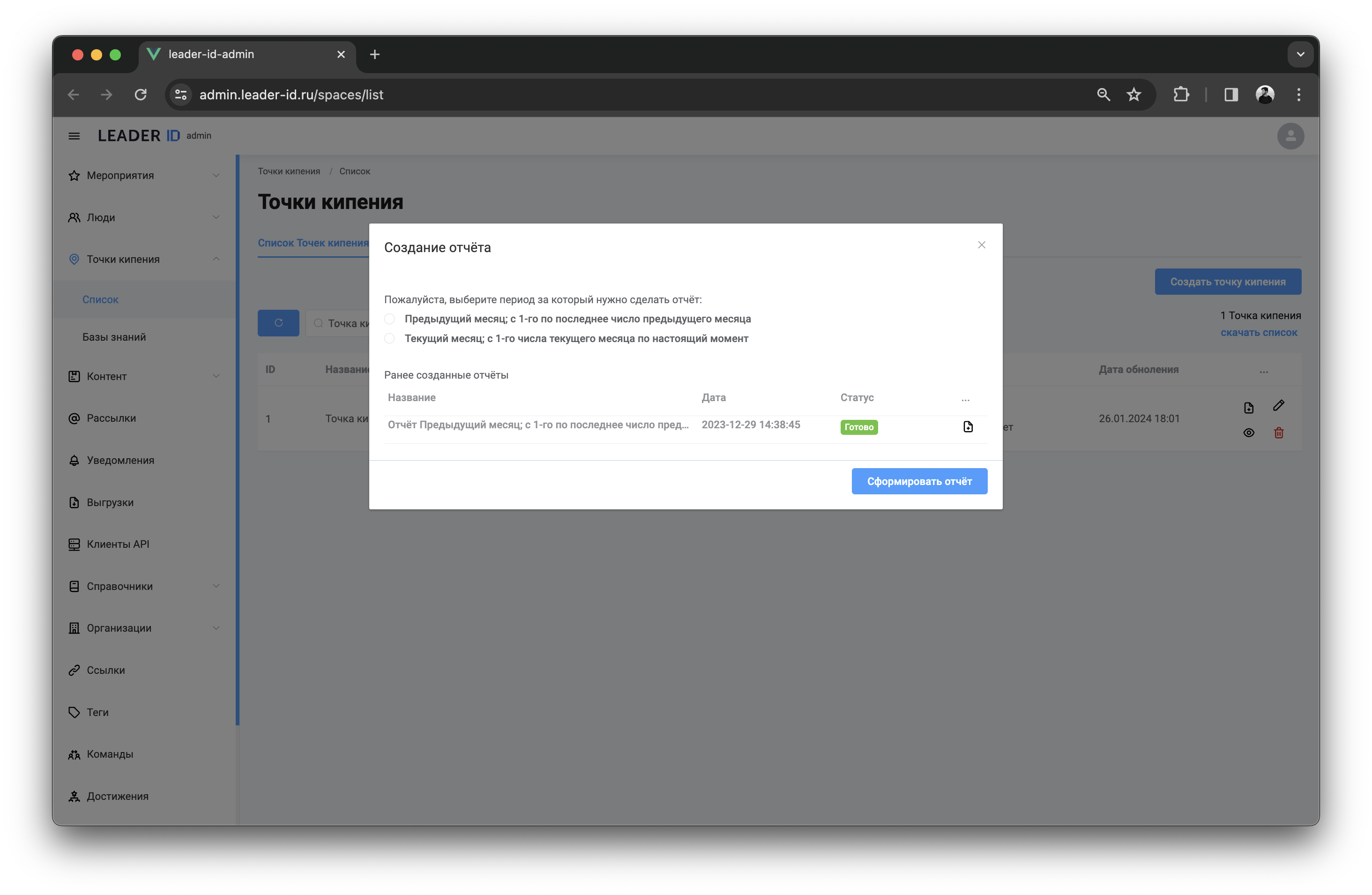 Сформировать отчёт о работе Точки кипения можно в разделе «Точки кипения» административного интерфейса. Для этого необходимо выполнить следующие шаги: