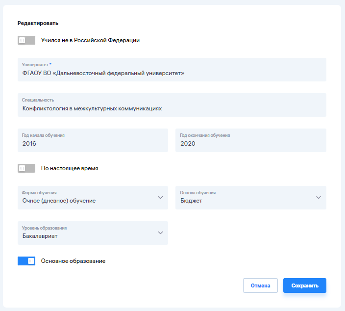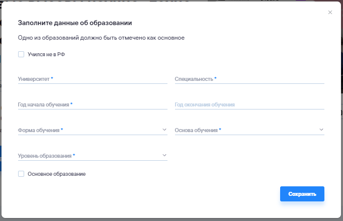 В случае, если место образования не было до этого заполнено пользователь самостоятельно, при подаче заявки на мероприятие с тематикой ПТК всплывёт окно с просьбой заполнить образование: