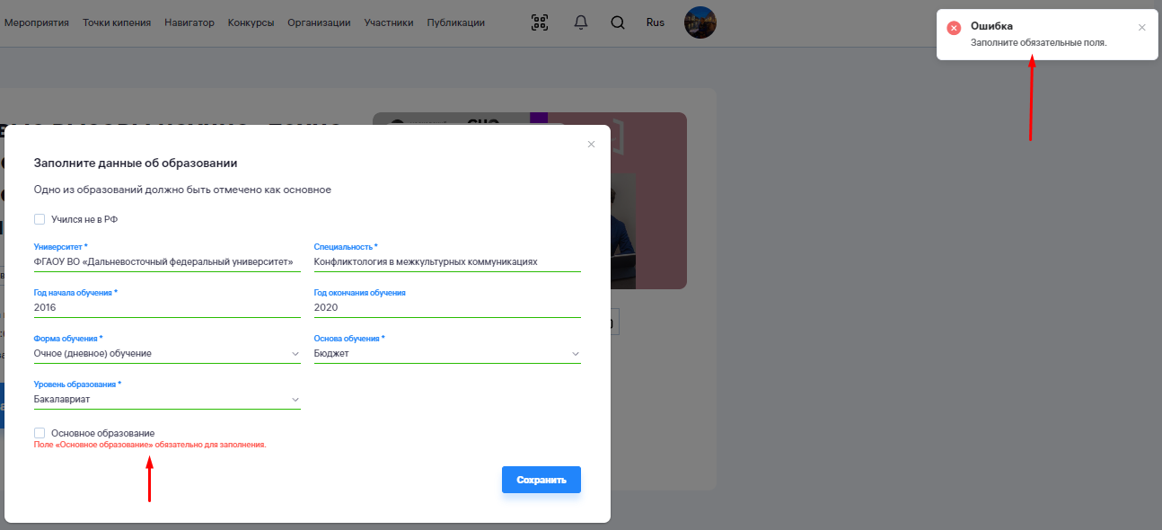 Обращаем ваше внимание, что заполнение образования является обязательным элементом для подачи заявки на участие в мероприятии с темой «ПТК».