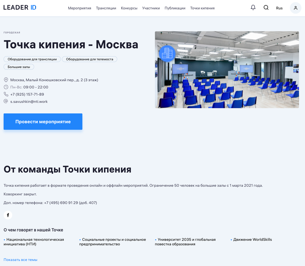 - адрес Точки кипения с ее отображением на Яндекс.Картах;