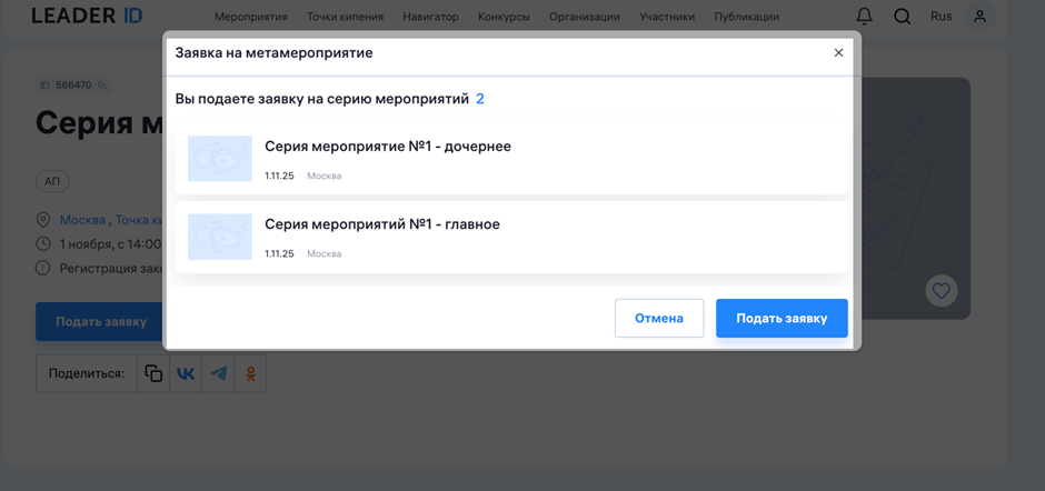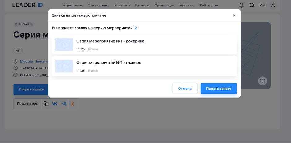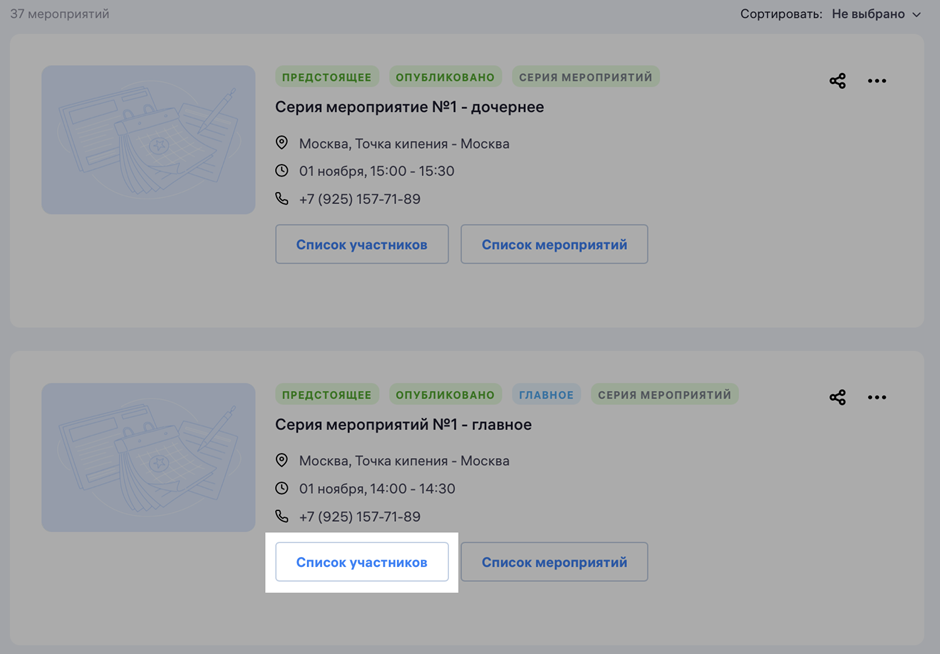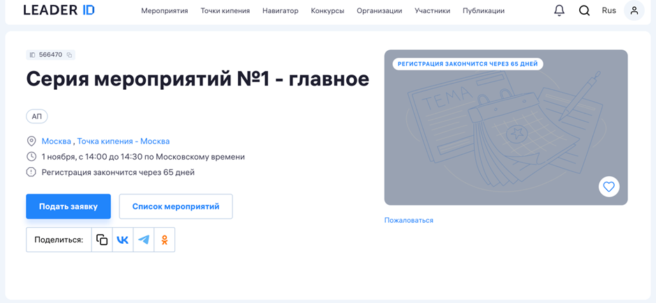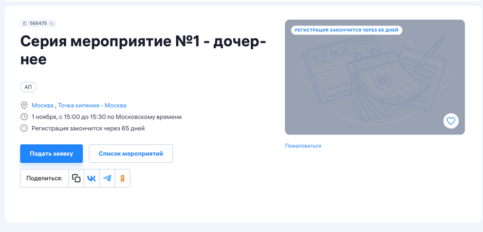В разделе «Мои мероприятия» можно увидеть серийные мероприятия. Тегом «Главное» выделено выбранное ранее мероприятие.