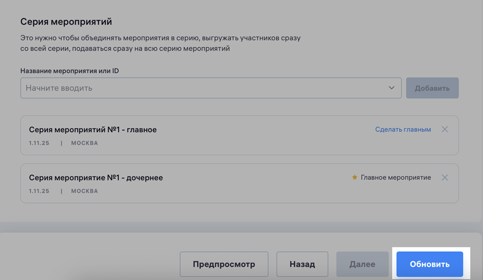 После этого можно выбрать, какое из мероприятий будет главным, а какое дочерним. Чтобы все изменения были сохранены, необходимо нажать на кнопку «Обновить».