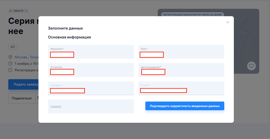 Нажать на кнопку «Подать заявку». Заполнить все необходимые поля.