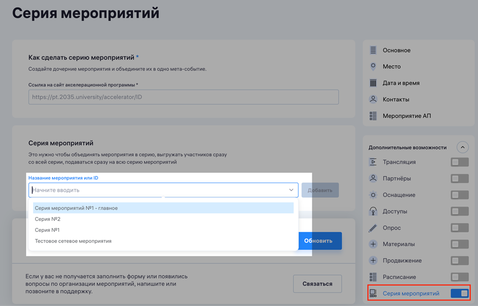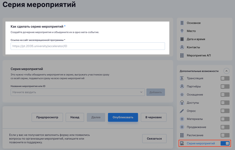 Затем в панели инструментов «Дополнительные возможности» включить тумблер «Серия мероприятий». «Ссылка на сайт акселерационной программы» — это ссылка созданного акселя на платформе Projects.