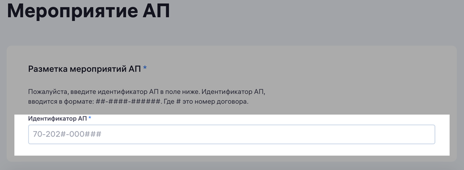 В разделе «Мероприятия АП» необходимо ввести Идентификатор мероприятия. Если мероприятие создается до заключения Договора, можете указать номер заявки. А после получения номера соглашения между НТИ и вузом-грантополучателем сможете через обращение в поддержку скорректировать номер.