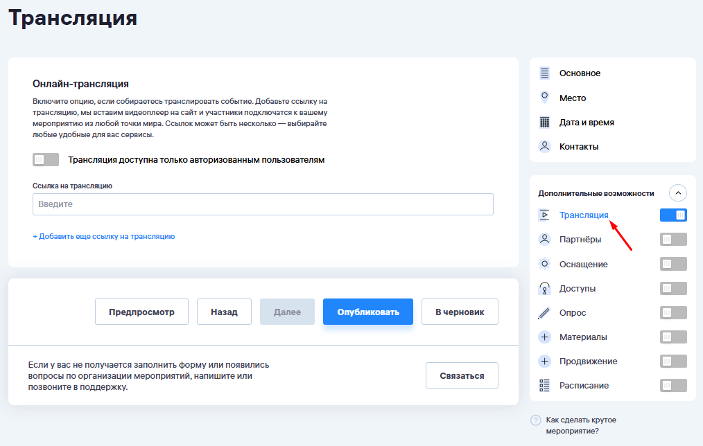 Если ваше мероприятие проходит в очном формате, но вы хотите, чтобы участники могли подключиться к онлайн-трансляции, вы можете добавить ссылку на трансляцию прямо в карточку мероприятия.