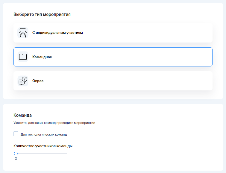 Если вы хотите создать мероприятие, участие в котором могут принимать только команды, то на 1 этапе — «Основное» в пункте «Выберите тип мероприятия» выберите «Командное»: