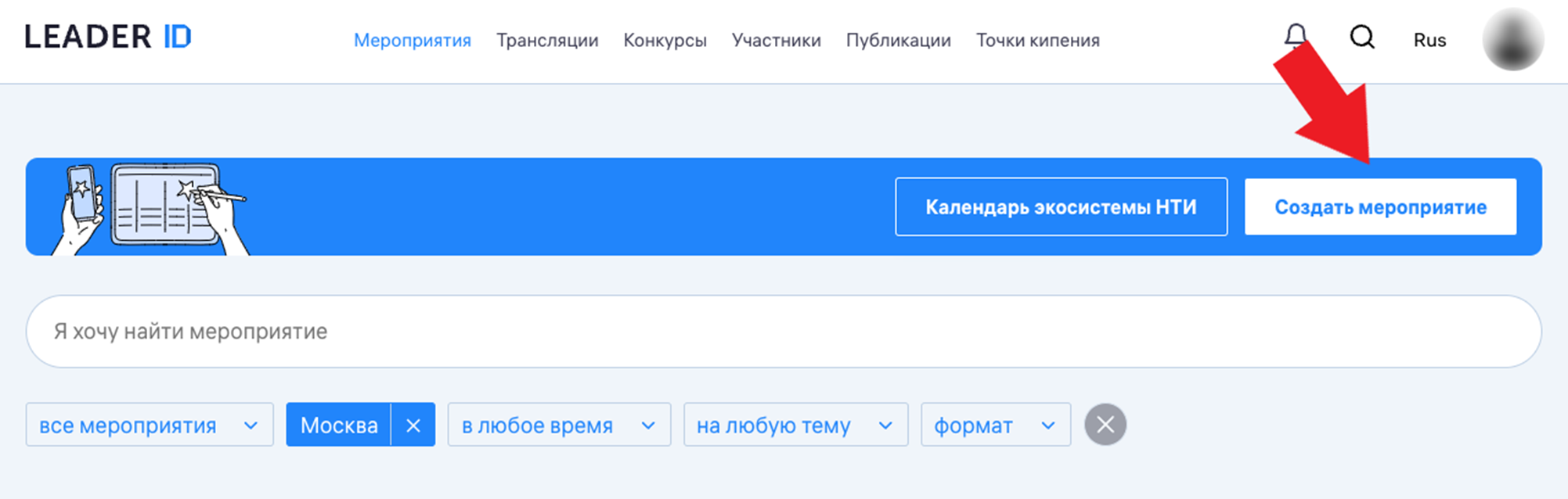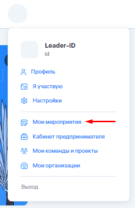 - Чтобы отправить на рассмотрение заявку на публикацию вашего мероприятия на сайте Leader-ID, откройте в своем профиле раздел «Кабинет организатора»: