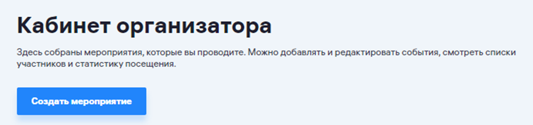 Также создать мероприятие можно находясь в разделе «Мероприятия», в котором кнопка «Создать мероприятие» расположена в правом верхнем углу: