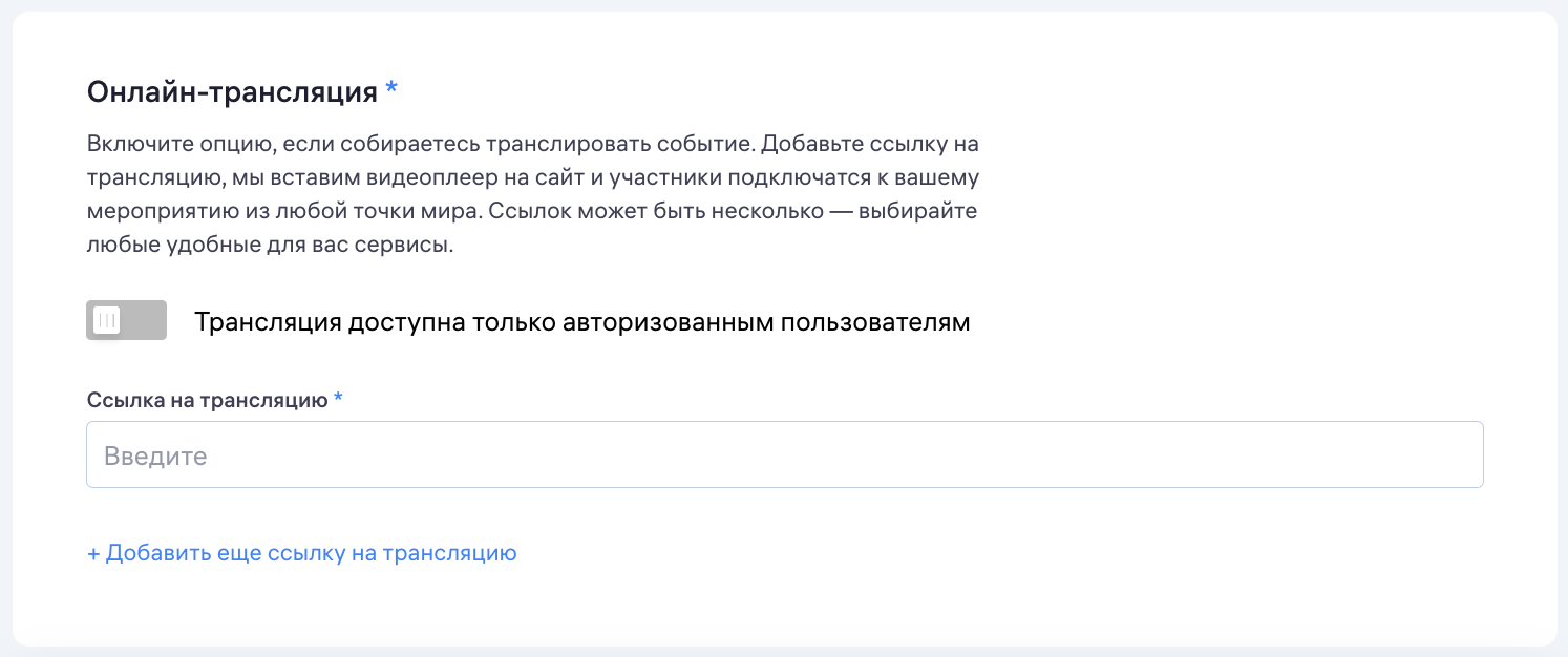 В данном поле вы можете указать ссылку трансляцию на Youtube, ВКонтакте, Zoom или другие платформы.