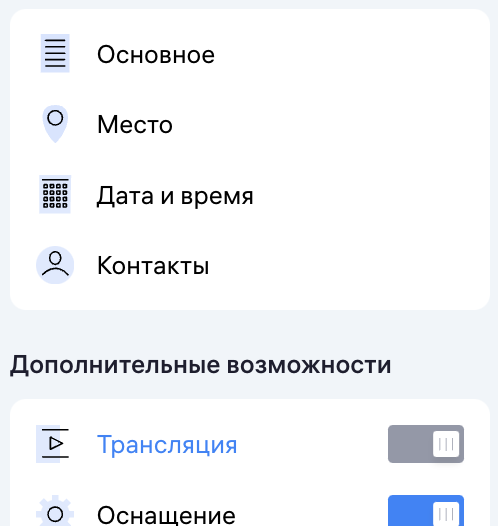 Для добавления видеотрансляции при создании/редактировании мероприятия перейдите в раздел «Трансляция»: