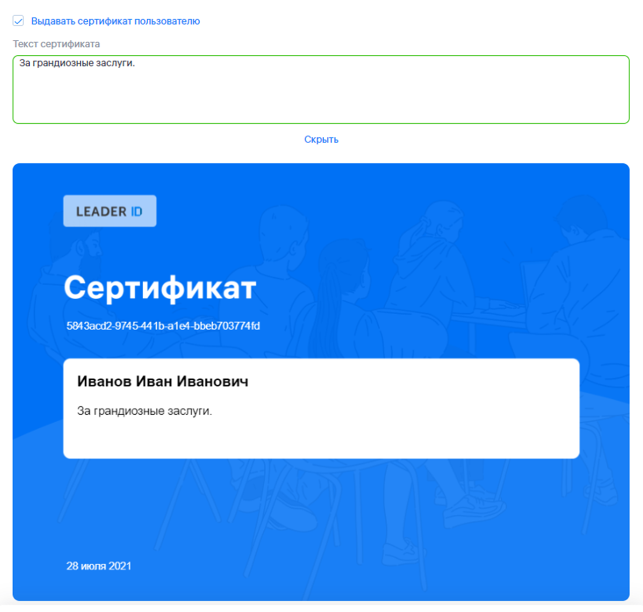 Текст сертификата является необязательной опцией. Без текста он будет выглядеть следующим образом: