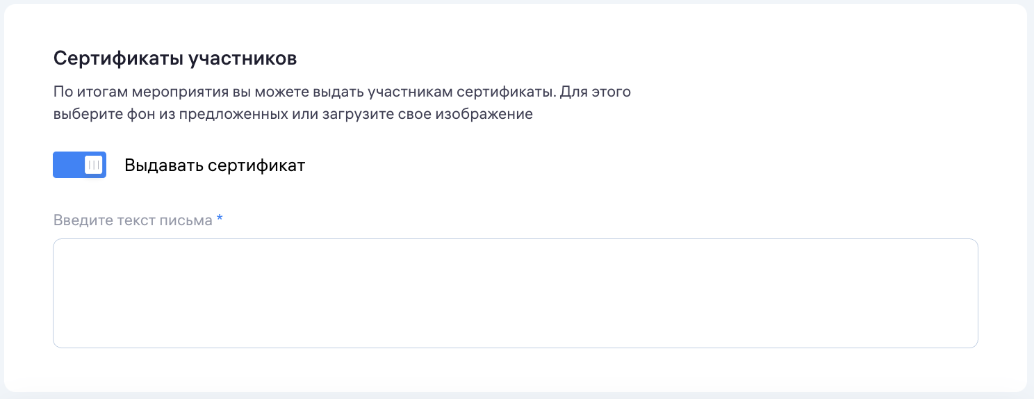 Вы можете включить автоматическое формирование сертификатов участникам мероприятия по итогам его посещения.