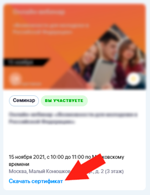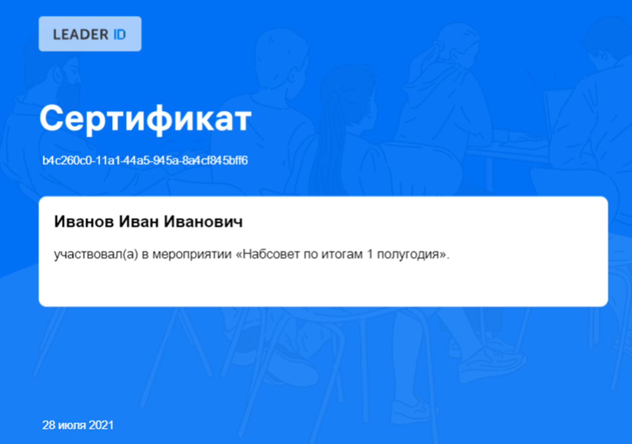 По окончанию мероприятия пользователям, чье участие было подтверждено, на почту автоматически поступит письмо со ссылкой для скачивания сертификата, а также он будет доступен в его профиле в разделе «Я участвую», пример: