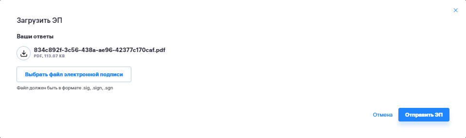 - Открывается окно, куда нужно загрузить подписанный файл в формате .sig, .sgn, .sign (если скачивание не началось автоматически, то вы можете скачать файл, нажав на иконку слева от названия анкеты): _**Обращаем ваше внимание на то, что изменять название скачанного файла нельзя, оно должно соответствовать тому, что выдаётся при предпросмотре файла в браузере. Если у вас возникла ошибка при загрузке подписанного файла, проверьте соответствие названия скачанного файла