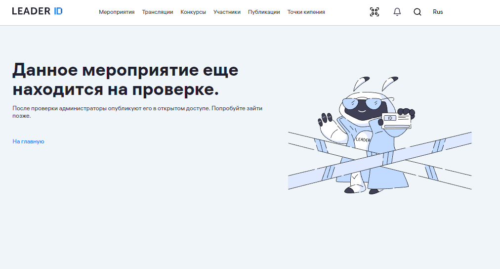 При переходе на страницу мероприятия до завершения его модерации потенциальному участнику мероприятия отображается следующее уведомление: