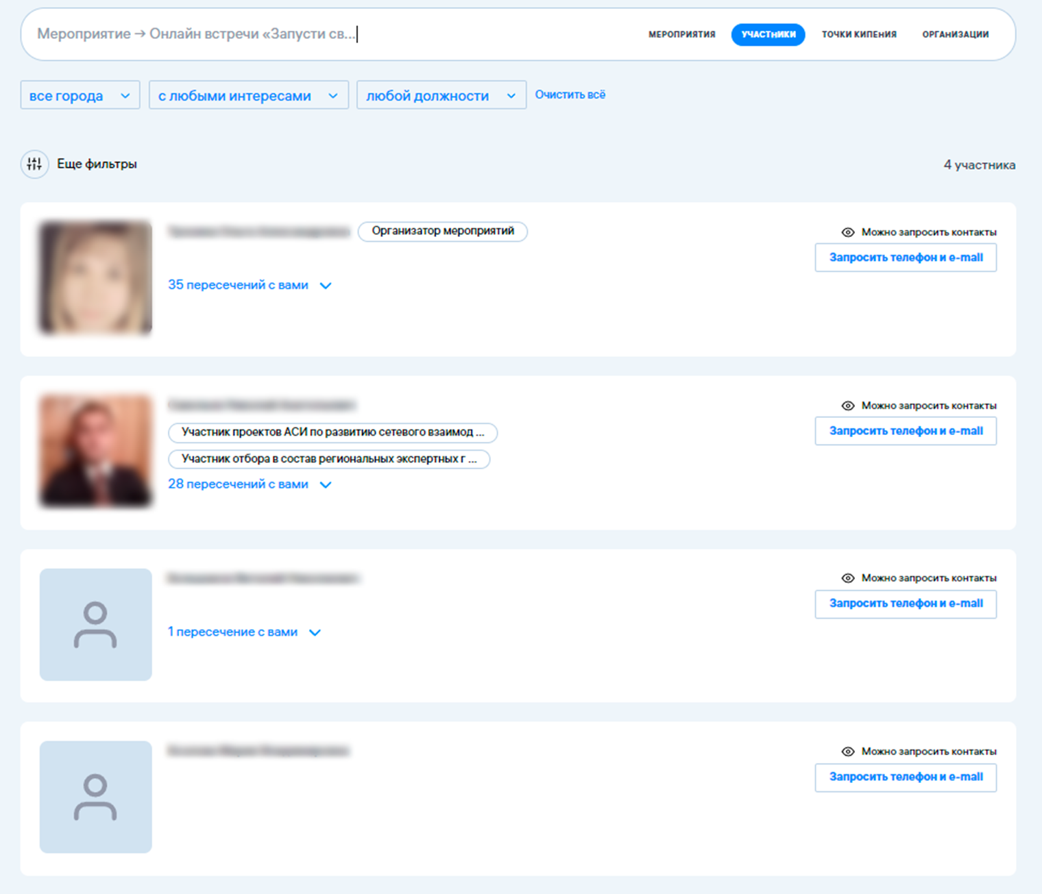 При нажатии на поле «Уже участвуют» открывается окно со списком участников данного мероприятия. В этом блоке не отображаются участники, которые скрыли свой профиль из публичной части в настройках приватности своего профиля (галочка «Я не хочу, чтобы мою страницу находили другие участники Leader-ID»).