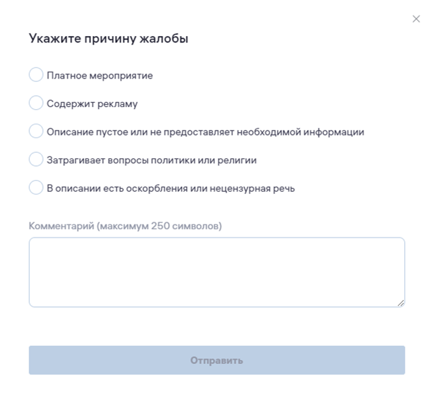 - Кнопка «Пожаловаться» на мероприятие открывает окно, в котором пользователь может оставить какую-либо жалобу на мероприятие.
