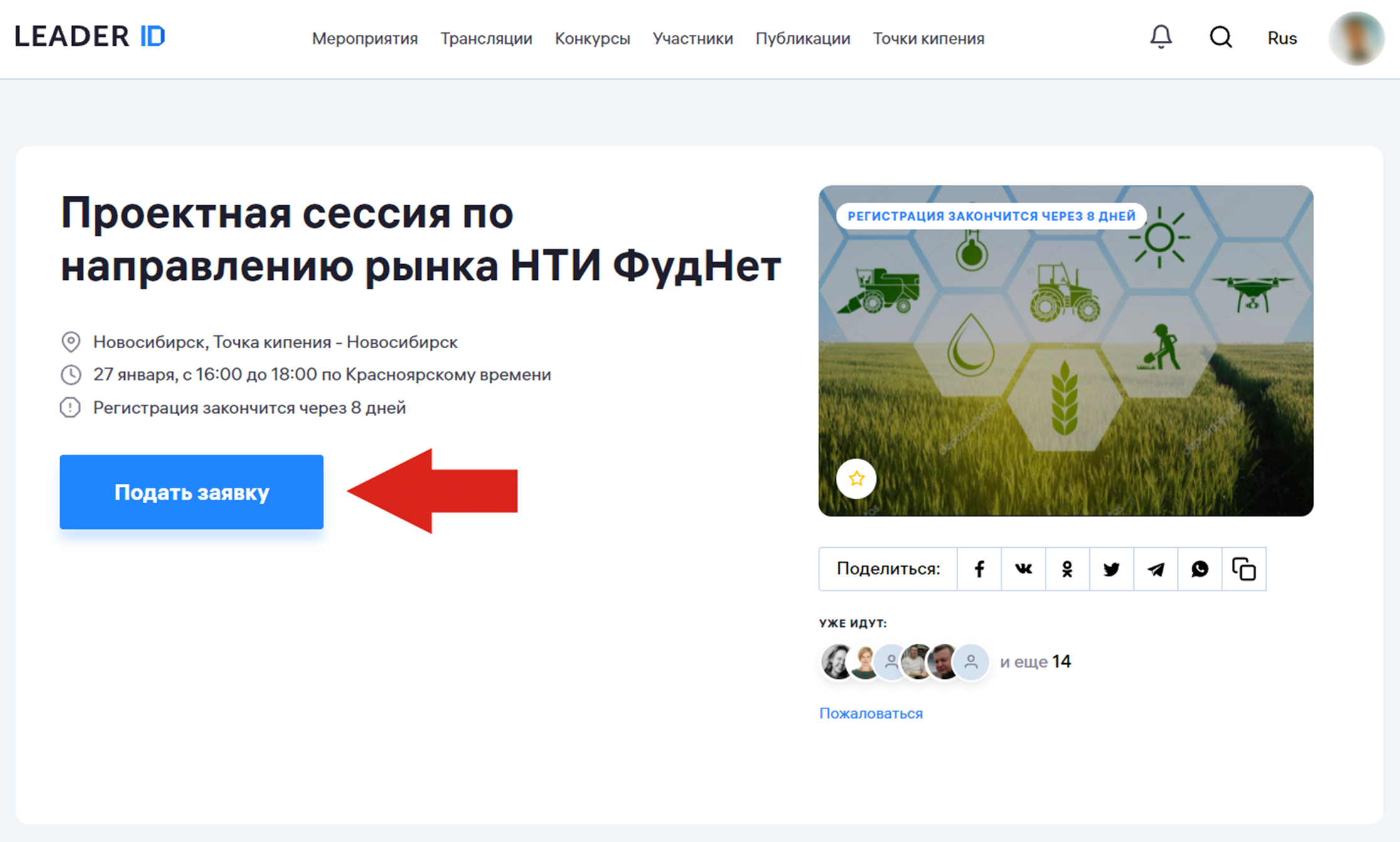 Откройте страницу интересующего вас мероприятия и нажмите кнопку «Подать заявку»: