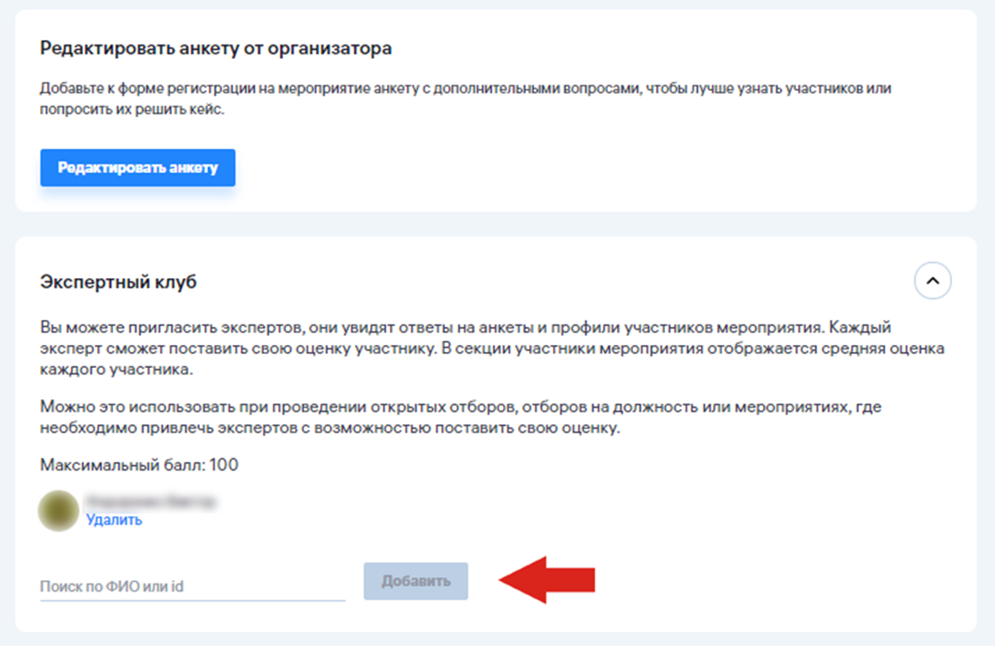 Для мероприятий с анкетой от организатора доступна возможность включить «Экспертный клуб» — функционал, позволяющий предоставить право определенным пользователям право оценки ответов. Экспертам будет доступна возможность видеть ответы на анкеты и профили участников мероприятия. Каждый эксперт сможет поставить свою оценку участнику. В секции участники мероприятия отображается средняя оценка каждого участника.