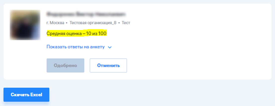 Эксперт может посмотреть ответы на вопросы анкеты и поставить оценку от 0 до 100.