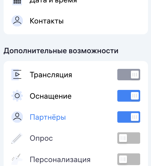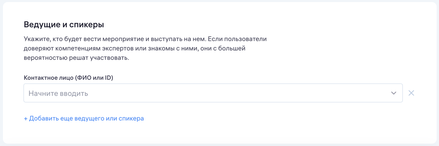 Вы можете указать в вашем мероприятии пользователей, которые будут вести мероприятие и выступать на нем. Для этого на странице создания или редактирования мероприятия перейдите на этап «Партнёры».