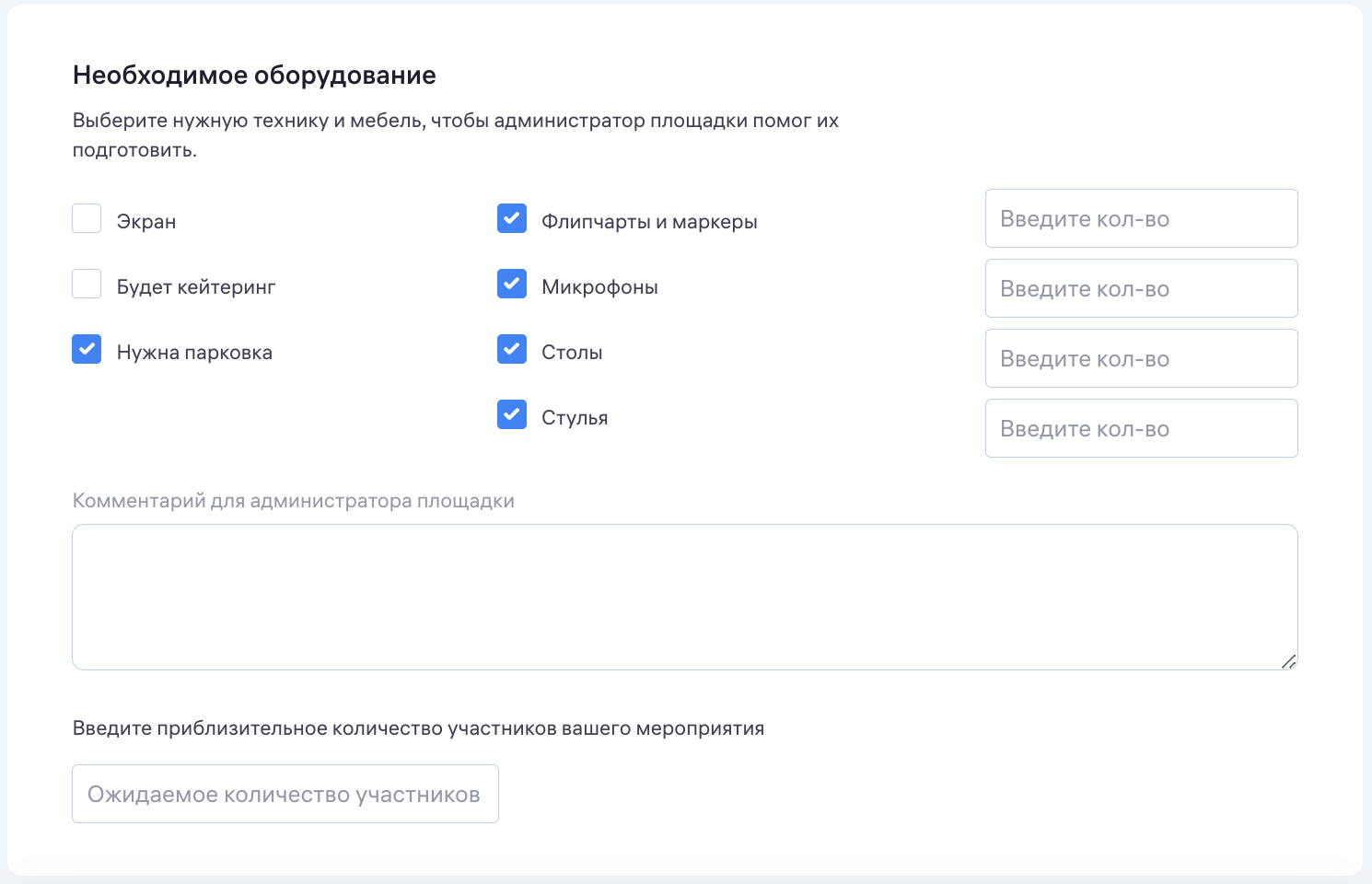 Блок позволяет отметить оборудование, которое потребуется для проведения мероприятия. При модерации мероприятия администратор Точки кипения ознакомится с указанными пожеланиями. Обратите внимание — оборудование может быть предоставлено только при наличии технической возможности. Также вы можете указать комментарий для администратора площадки в свободной форме.