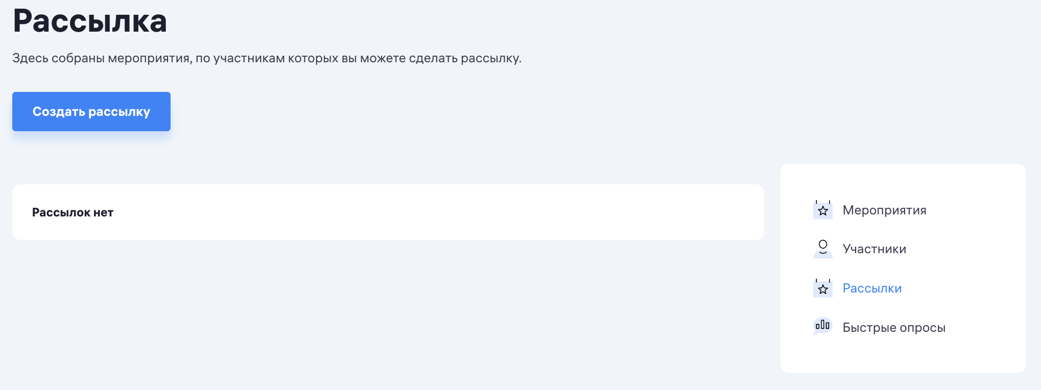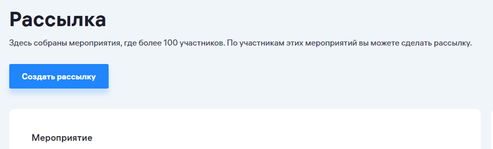 - Если в вашем мероприятии более 50 участников, вы можете сами создать рассылку в разделе «Рассылки» в «Кабинете организатора»