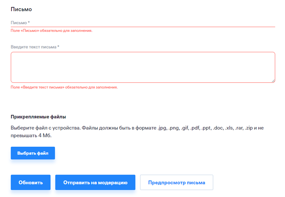 Откроется страница с формой письма, которую необходимо заполнить. После заполнения нажмите кнопку «Создать рассылку» и «Отправить на модерацию».