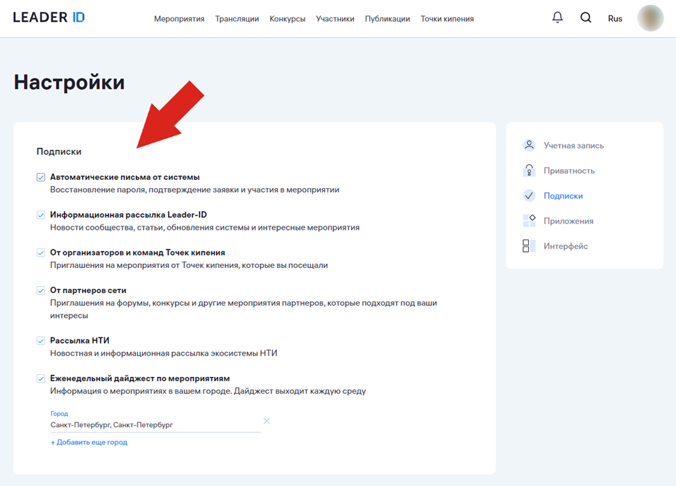 Вы можете управлять подписками на рассылки в настройках вашего профиля. Чтобы перейти в настройки нажмите на иконку профиля в правом верхнем углу и во всплывающем меню выберите пункт «Настройки».