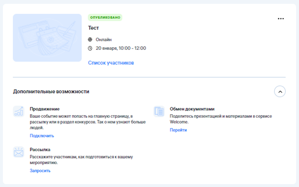 Каждому одобренному мероприятия можно добавить продвижение или иные опции в блоке «Дополнительные возможности», который расположен внизу на карточке мероприятия. Для открытия блока необходимо нажать «˅» внизу справа на карточке мероприятия:
