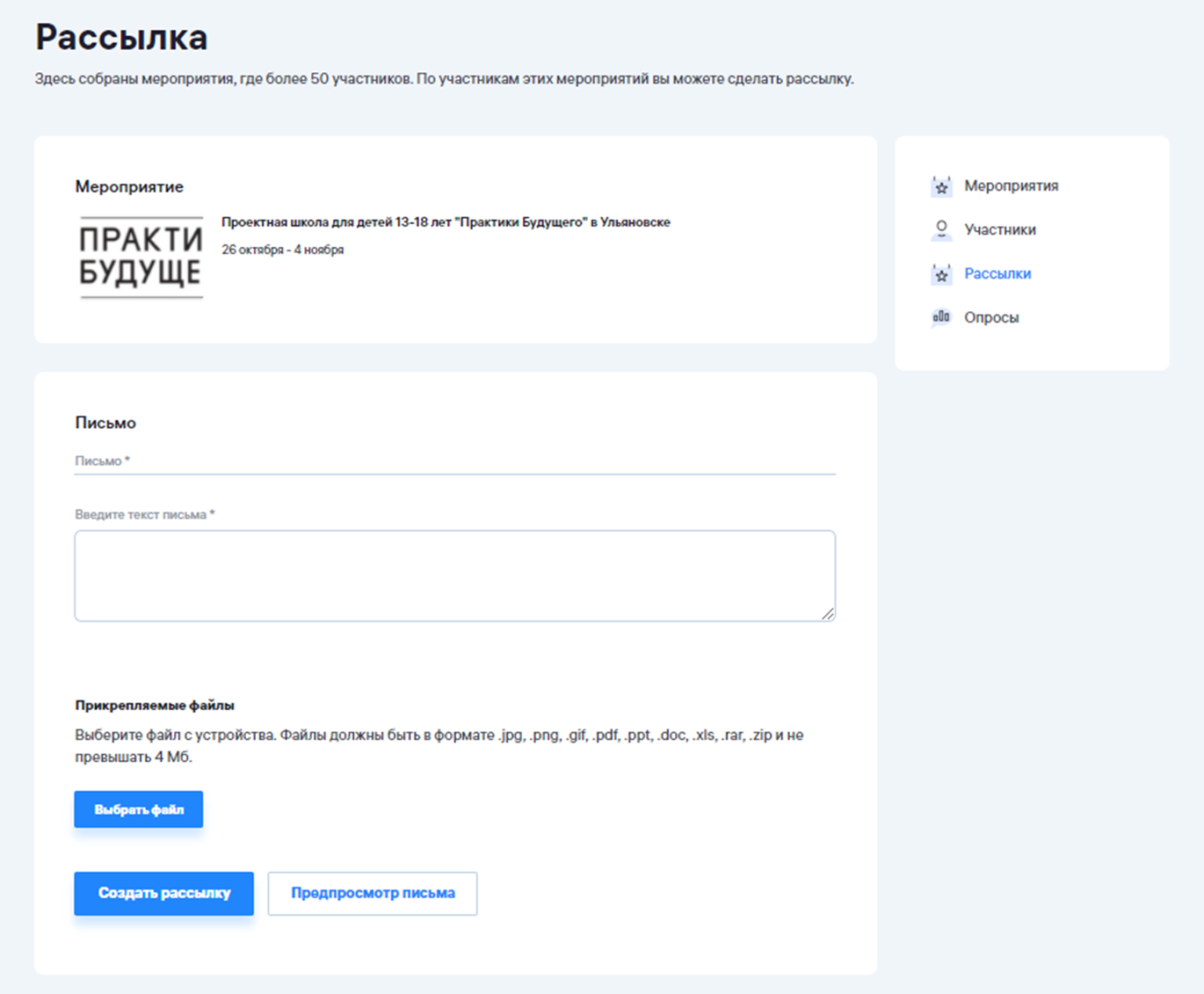 После нажатия кнопки «Создать рассылку» откроется форма для заполнения письма участникам мероприятия:
