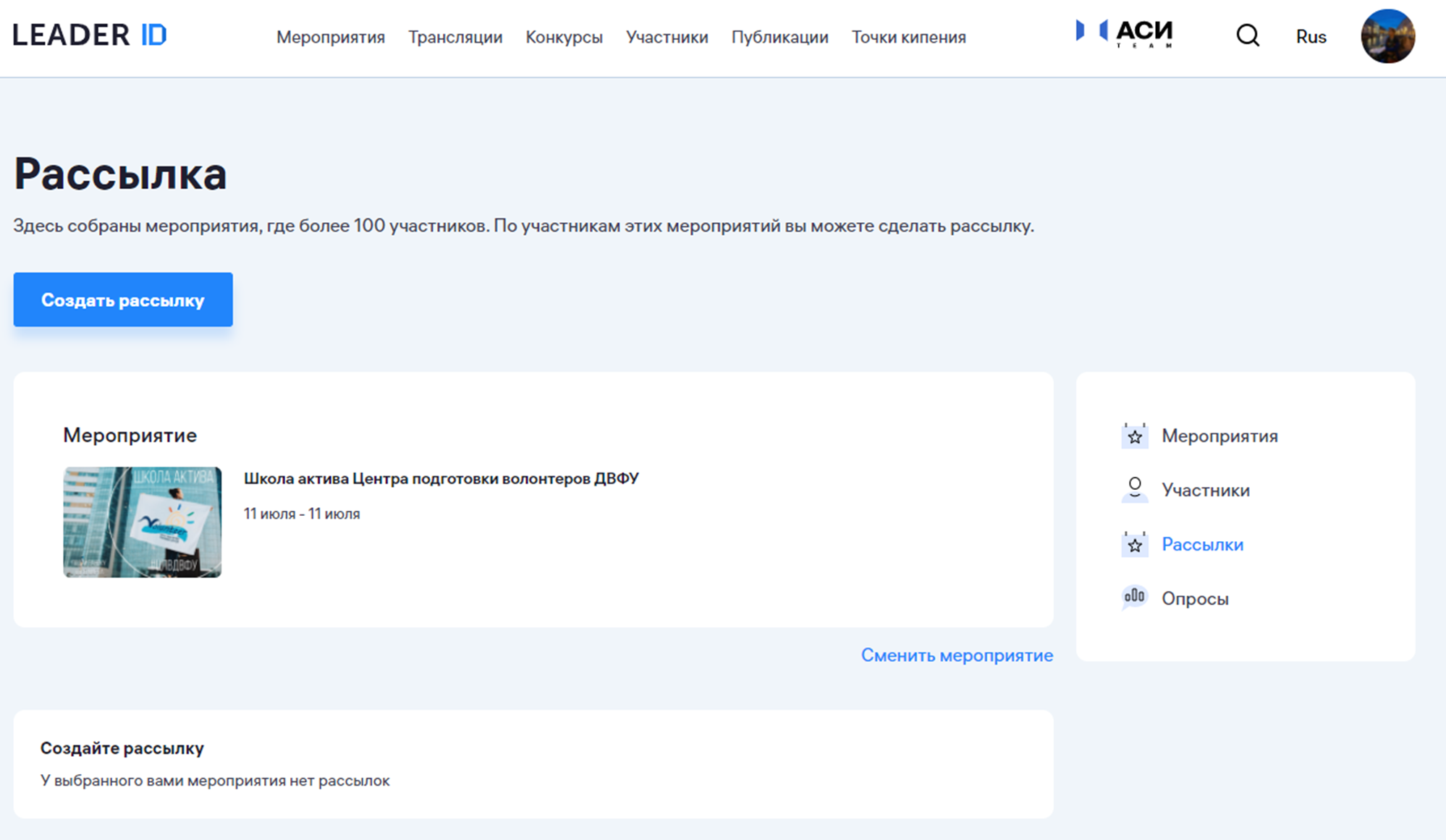 - Рассылка — произойдет переход в раздел, в котором вы можете создать и отправить на рассмотрение рассылку для отправки её по участникам вашего мероприятия.