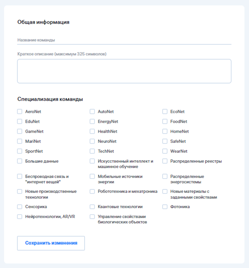 - Специализация команды — по желанию вы можете указать ее специализацию по рынкам НТИ (описание рынков НТИ доступно по ссылке) или теме из предложенных на странице. Это поможет организаторам мероприятий в понимании направленности вашей команды.