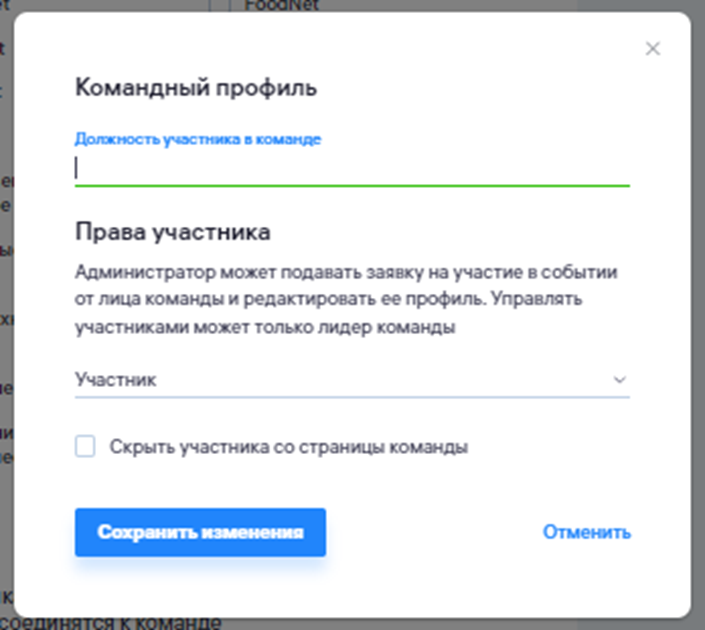 Лидер команды может указать должность участника в команде, а также выбрать его роль (обычный участник или администратор). Также лидер может скрыть участника со страницы команды.