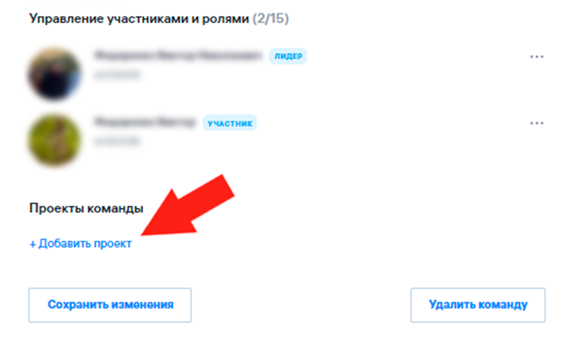 Лидер команды может добавить проект над которым работает команда: