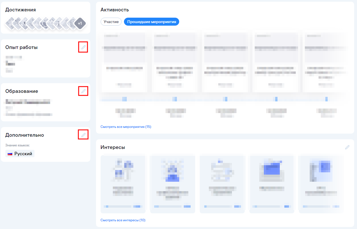 Раздел отображает определенные достижения участников платформы, за которые даётся награда в виде «бейджа» на странице профиля. Получить их можно при активном участии в мероприятиях в разных ролях: участник, спикер, организатор.