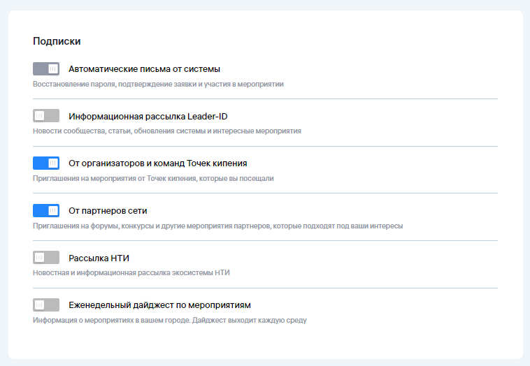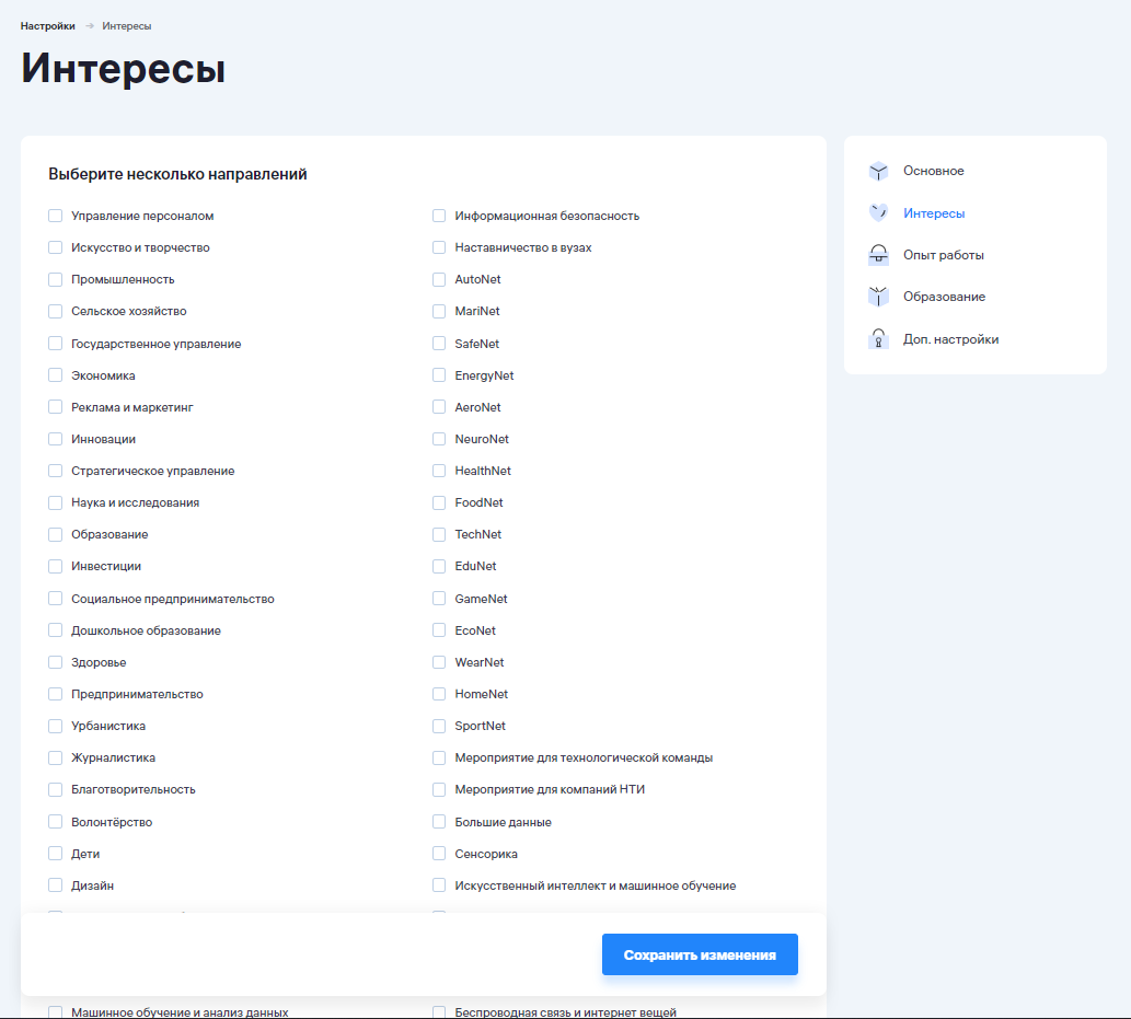 Здесь вы можете установить ваши интересы, по которым будут составлять индивидуальные рассылки с приглашением на мероприятия.