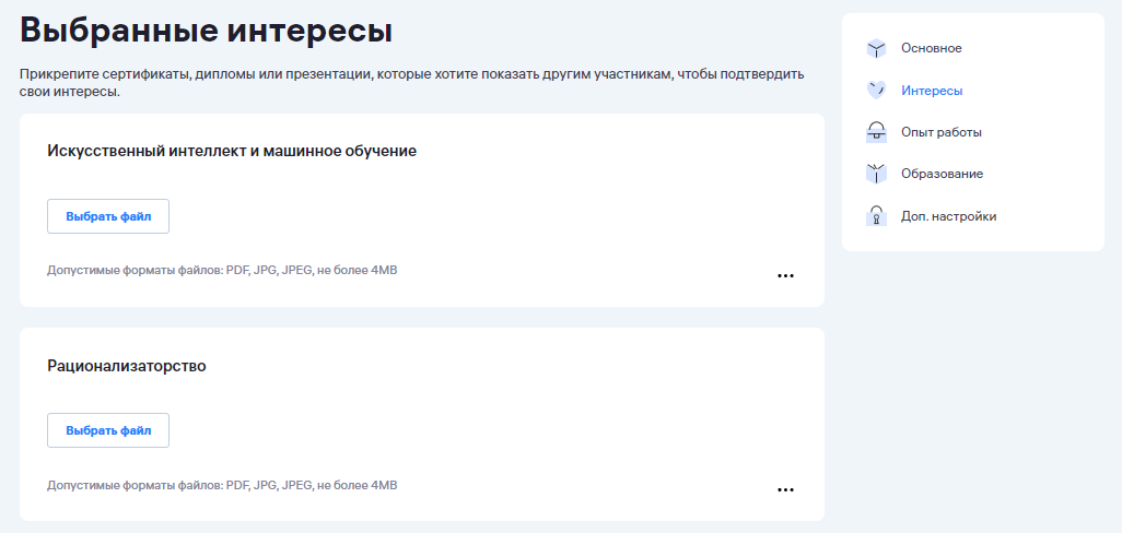 Ниже вы можете прикрепить сертификаты, дипломы или презентации, которые хотите показать другим участникам, чтобы подтвердить свои интересы.