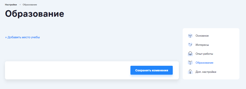 В этом разделе вы можете отредактировать место обучения, которое вы заполняли при регистрации профиля или добавить новое место обучения: