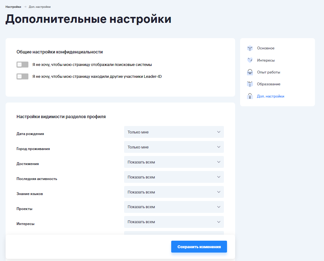В настройках профиля доступны пять разделов:
