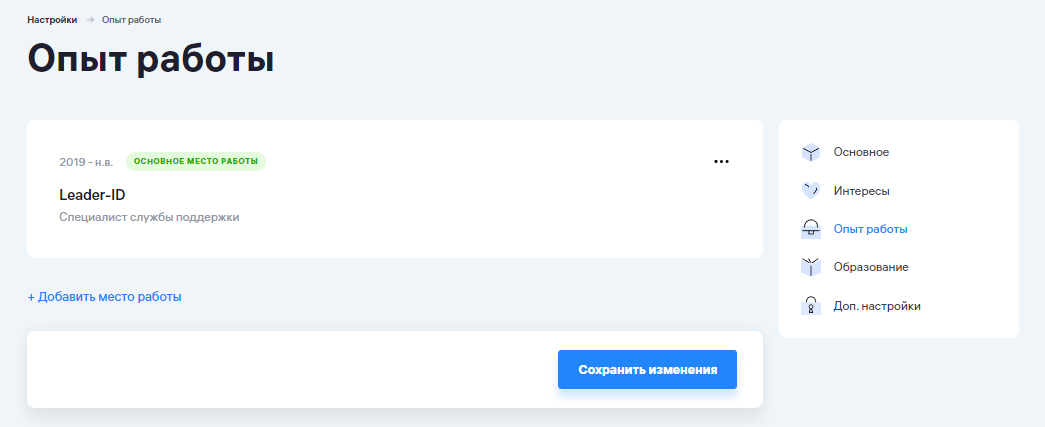 В этом разделе вы можете отредактировать место работы, которое вы заполняли при регистрации профиля или добавить новое место работы: