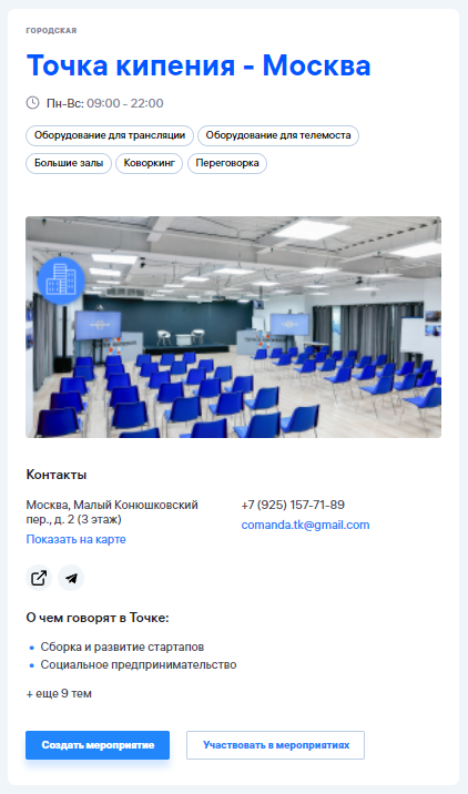 На странице «Точки кипения» отображаются все открытые Точки кипения, в которых можно либо провести мероприятие, либо прийти поработать в коворкинг зоне.
