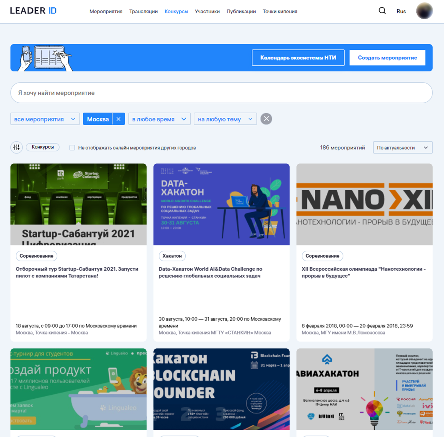 В разделе «Конкурсы» отображаются те мероприятия, в которых была включена опция «Разместить в "Конкурсах"». Это могут быть хакатоны, отборы и другие соревнования.