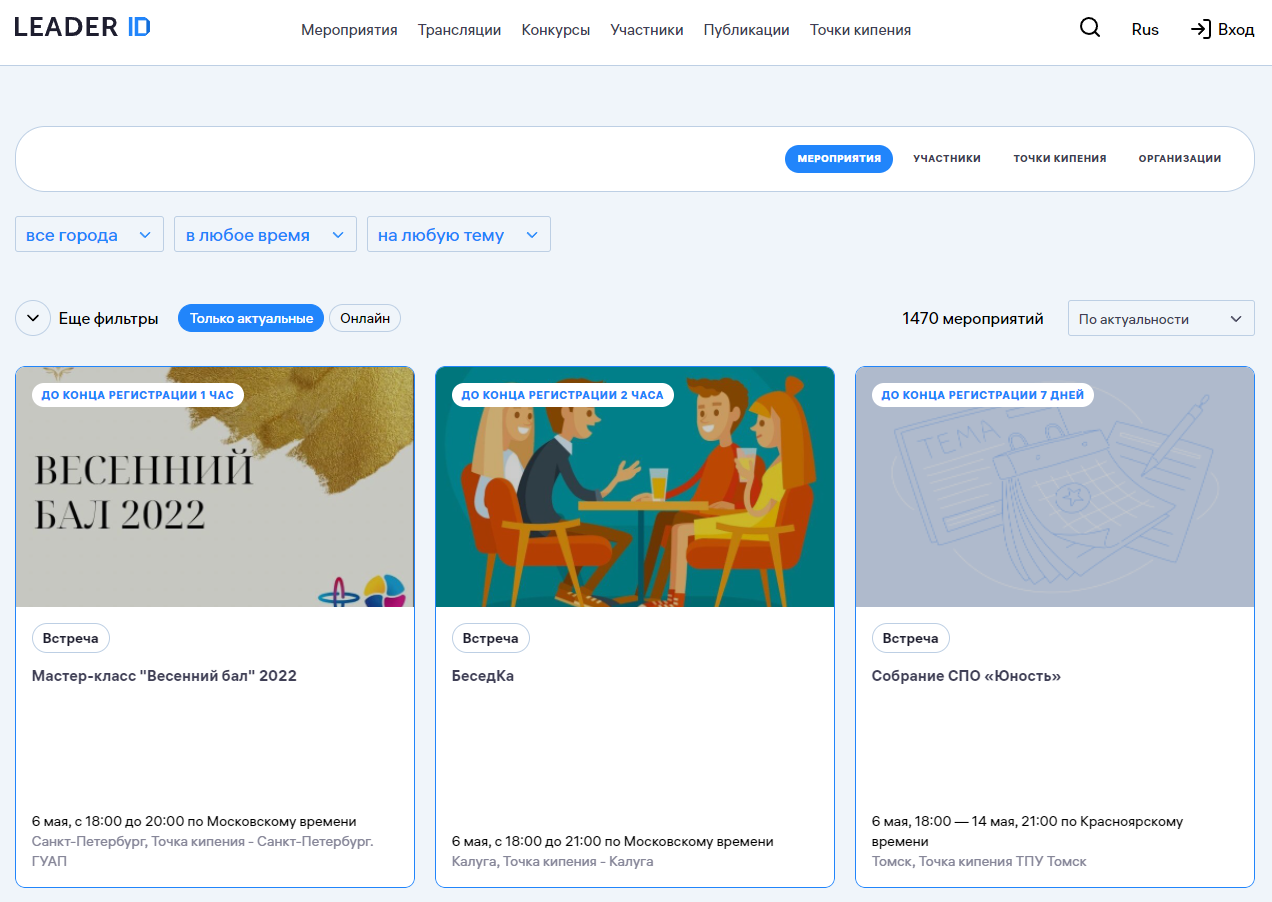 В системе Leader-ID присутствует несколько способов поиска нужной вам информации: людей, мероприятий, Точек кипения, организаций.